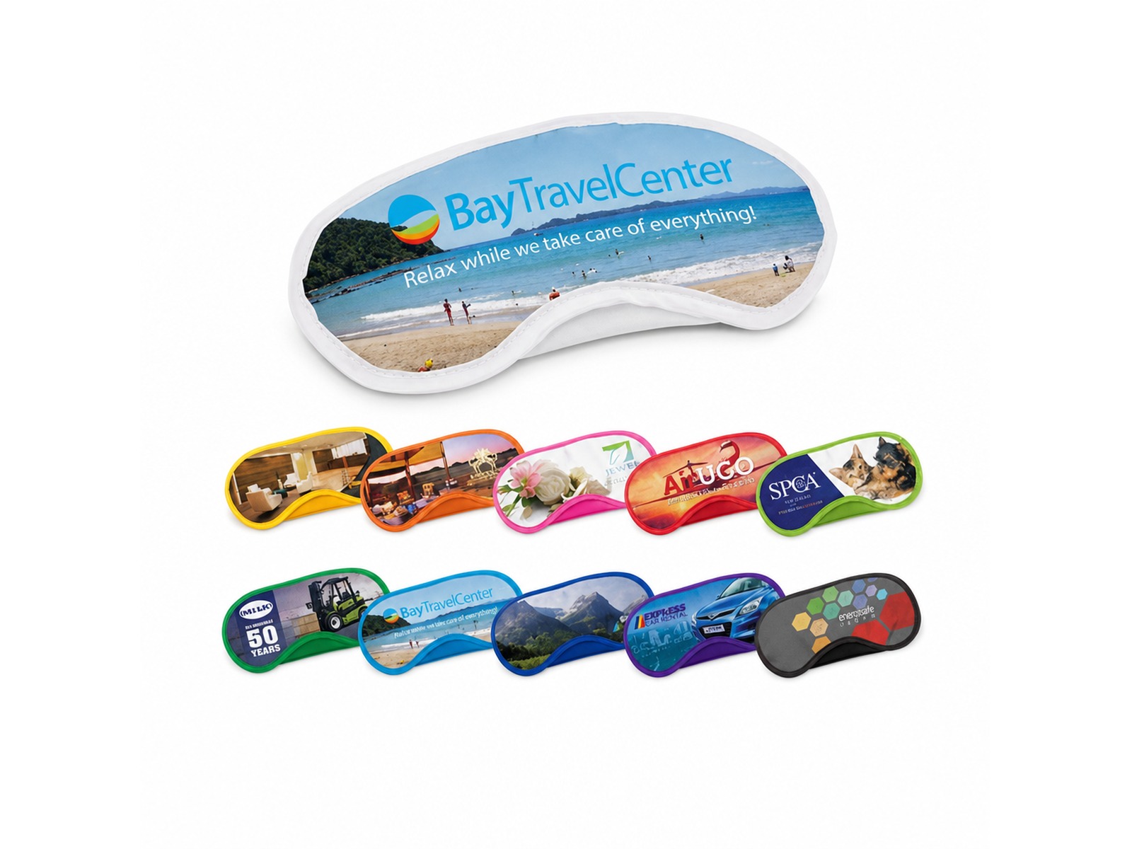 Our custom made Full Colour Printed Sleeping Masks can be produced from a minimum quantity of 250 pieces.