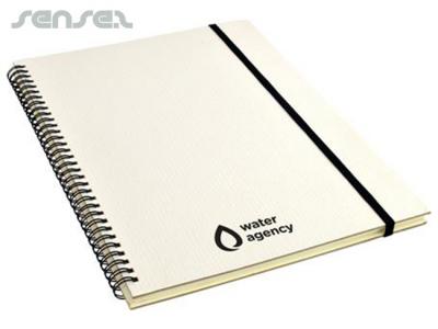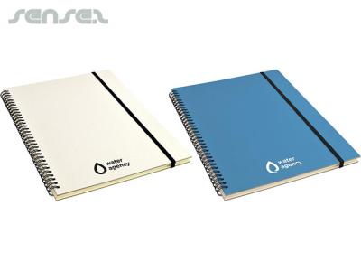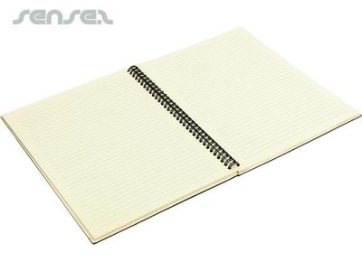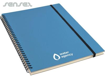 These beautiful A4 notebooks feature a wood grain design cardboard cover that oozes individuality. The notebook has a spiral binding (which allows the solid cover to be folded flat behind the book – for ease of use) as well as elastic closure. The bespoke spiral notebooks are also available in blue or white.