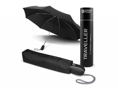 Werner Swiss Peak Branded Umbrellas will help you stay dry. This compact three stage Swiss Peak Branded umbrella features automatic opening and closing and is thoughtfully presented in a printed gift tube. This custom compact umbrella has a wind proof 53 cm pongee canopy along with a chromed aluminium shaft, fibreglass ribs and a carry pouch. Perfect as a special gift!