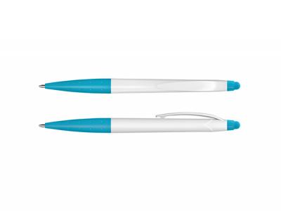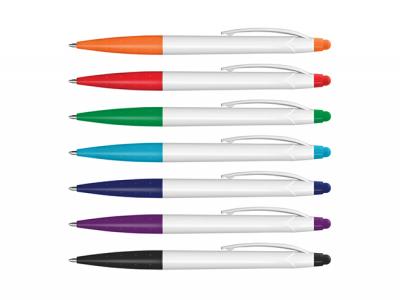 Twist action plastic ball pen with a white barrel and a stylus for use with touch screens. It has a black ink refill with 500 metres of writing ink and a tungsten carbide ball for improved writing quality. Perfect for conventions!