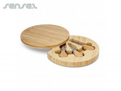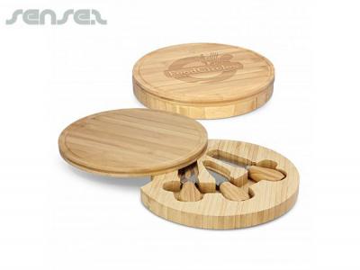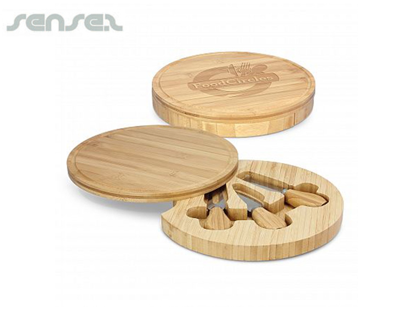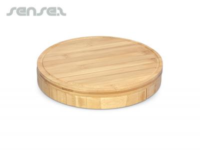 The personalised cheese boards is a deluxe bamboo swivel cheese board, inside is two cheese knives and a fork. Makes a excellent gift for employees and customers.