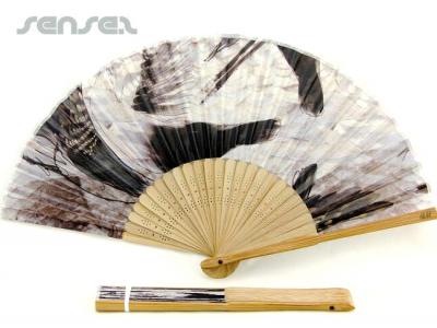 Ideal for classy outdoor event promotions these satin custom fans can be printed in full colour with your custom artwork. The intricate woodwork has a hand carved feel and makes these custom hand held fans the choice for a more traditional promotional gift. Great also for fashion themed promotions are female geared gift with purchase.