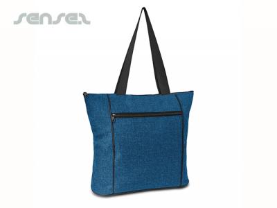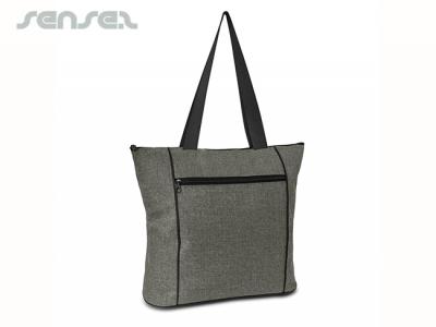 Our Premium Tote Bags are made from poly-canvas that is woven with different coloured fibres to create a very fashionable 'heather style' two tone fabric. It features a zippered front pocket, a secure zippered top closure and extra wide carry handles.