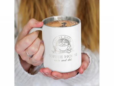 These 400ml BPA-free double wall reusable stainless steel cups keep drinks hot for longer! The black and white cups laser engrave to a shiny steel finish and the silver cup engraves to a natural etch.