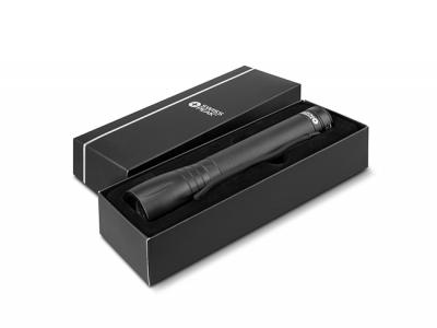 The laser engraves to an oxidised white colour and these promotional torches will be presented in a printed Swiss Peak gift box.