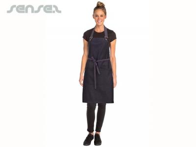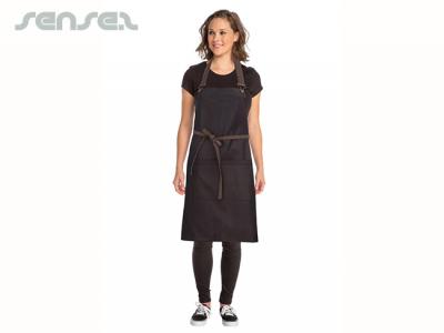 Dress your crew in a street-inspired urban-look and make a stylish statement with our custom embroidered aprons out of a fashion-line of culinary apparel! Let functionality and fashion become one! This workwear is manufactured from 100% cotton denim with a waxed finish look. Additionally, they come with a towel loop, reinforced stress points, an adjustable neck with overall clips and double front pockets.