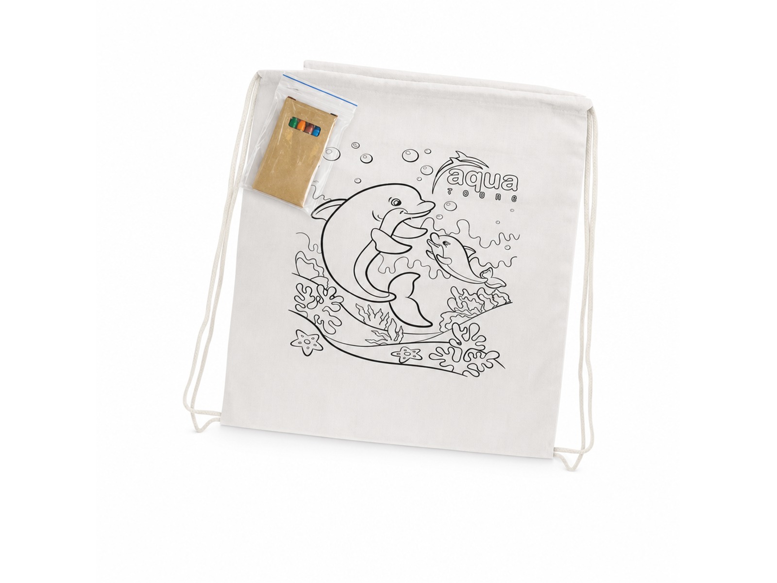 Colouring In Drawstring Backpacks environmentally friendly 120gsm cotton drawstring backpack which is supplied with a packet of six non-toxic crayons inside.
