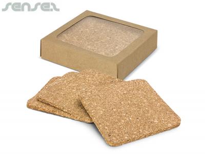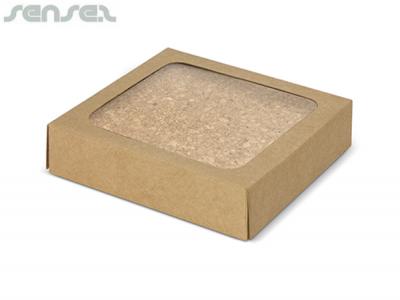 Island Square Cork Coaster Sets are a set of four natural non marking Cork Coasters with the choice of round or square options. The set is nicely presented in a natural cardboard gift box with a window to show off the brand.