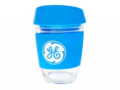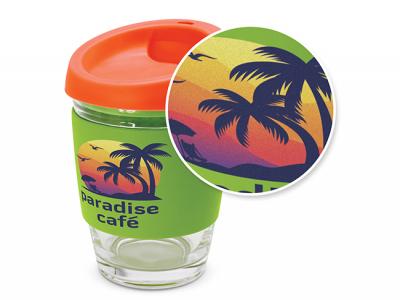 Personalize your glass coffee cups (340ml) or custom design glass travel cups for your marketing campaign.