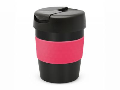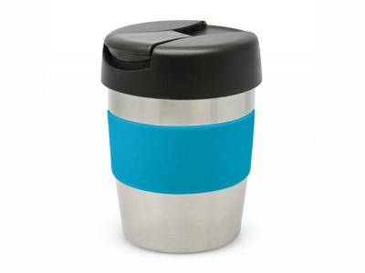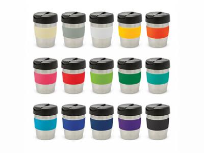 Premium 230ml double wall vacuum insulated reusable stainless steel cups which will keep coffee hot for approximatly three hours. It features a secure screw on lid with a flip closure seal which prevents leaks and spills even if the cup is knocked over. These reusable stainless steel cups have a soft touch silicone band and is presented in a black gift box. reusable stainless steel cups can also be supplied in a stylish gift tube at extra cost of AU$4.00 per unit (this could also come printed).