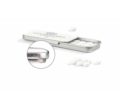 Small but impressive: Send refreshing messages with vegan peppermint Minties with Stevia. Thanks to the sliding lid with elegant doming that can be individually printed, the climate-neutral flat box provides a variety of application options, making it a perfect promotional article for a successful promotional message. A winning item made of 98% recyclable tin plate.