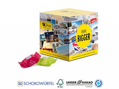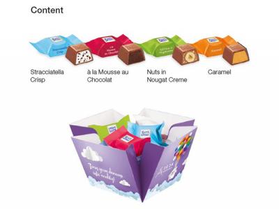 Upon being opened, the box cleverly transforms into a stylish tray with delicious contents. A colourful mix of 10 Ritter SPORT brand chocolate cubes guarantees a special treat for any promotional occasion. That makes it easy to share not only the candies: In addition, your message and business information will also be shared among a big audience. Let them become the highlight at the next party or corporate event!