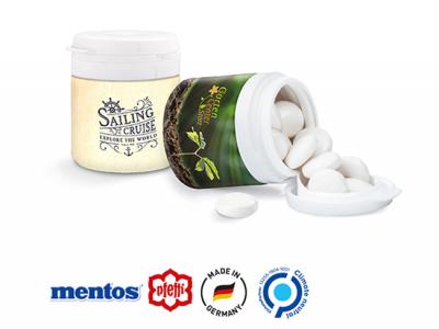 Small but impressive! These climate neutral white plastic cans with a tasty filling option and a tamper-evident closure can be used for a variety of applications. Thanks to the individually printable and transparent sleeve it is the ideal advertising item for memorable and long-lasting promotional messages.