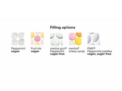 Content: Mini sweets, 40g - With surcharge: Pfeffi sugar-free peppermint pastilles, 35g; Mentos chewy candy (mint or fruit), 45g or Mentos sugar-free chewing gum (peppermint), 35g