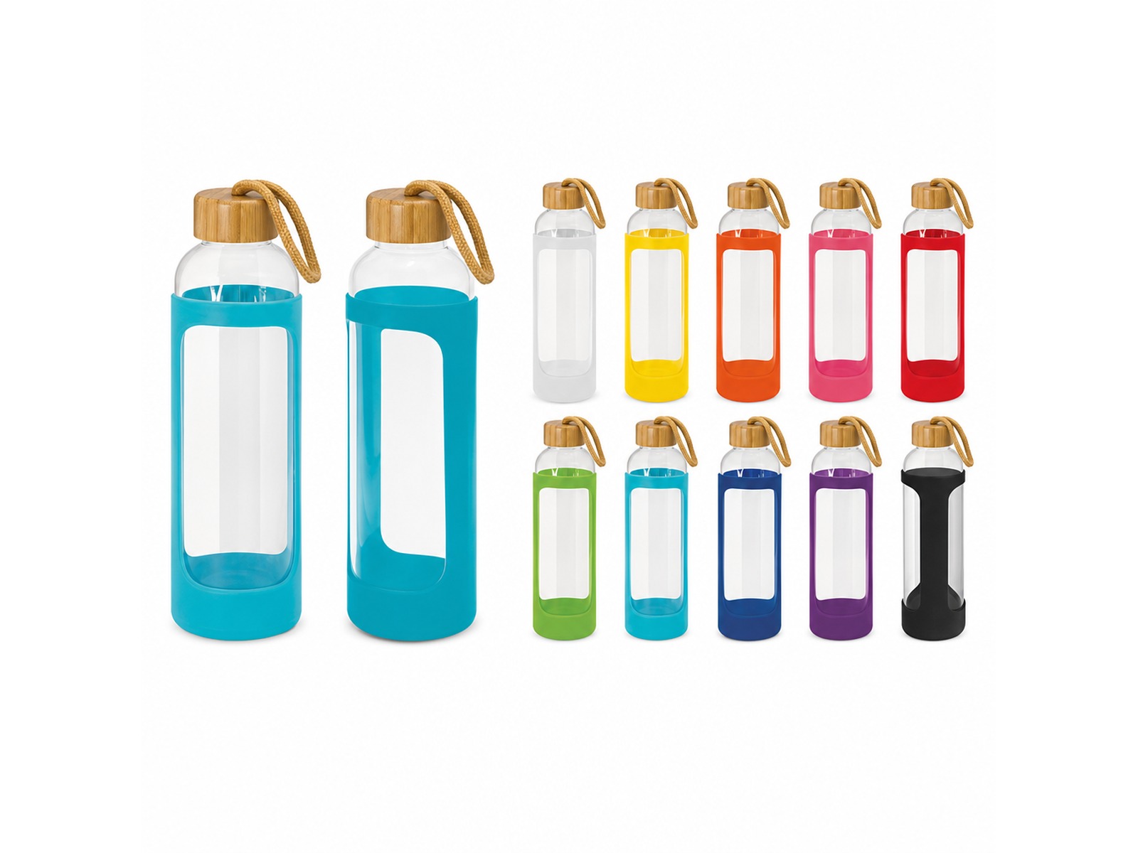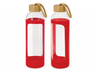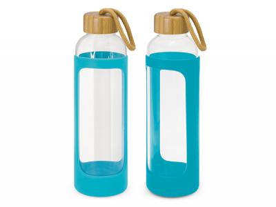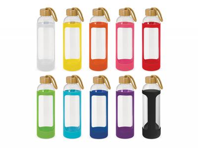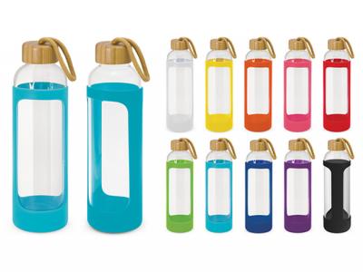 Glass Bottles with Silicone Sleeve are sophisticated 600ml borosilicate glass bottle which features a protective soft touch silicone sleeve with an on trend bamboo lid and a matching braided carry handle. Borosilicate is a lightweight glass which is exceptionally strong and shatter resistant. Glass is a natural choice for a clean, pure taste and it offers a safe and eco-friendly alternative.