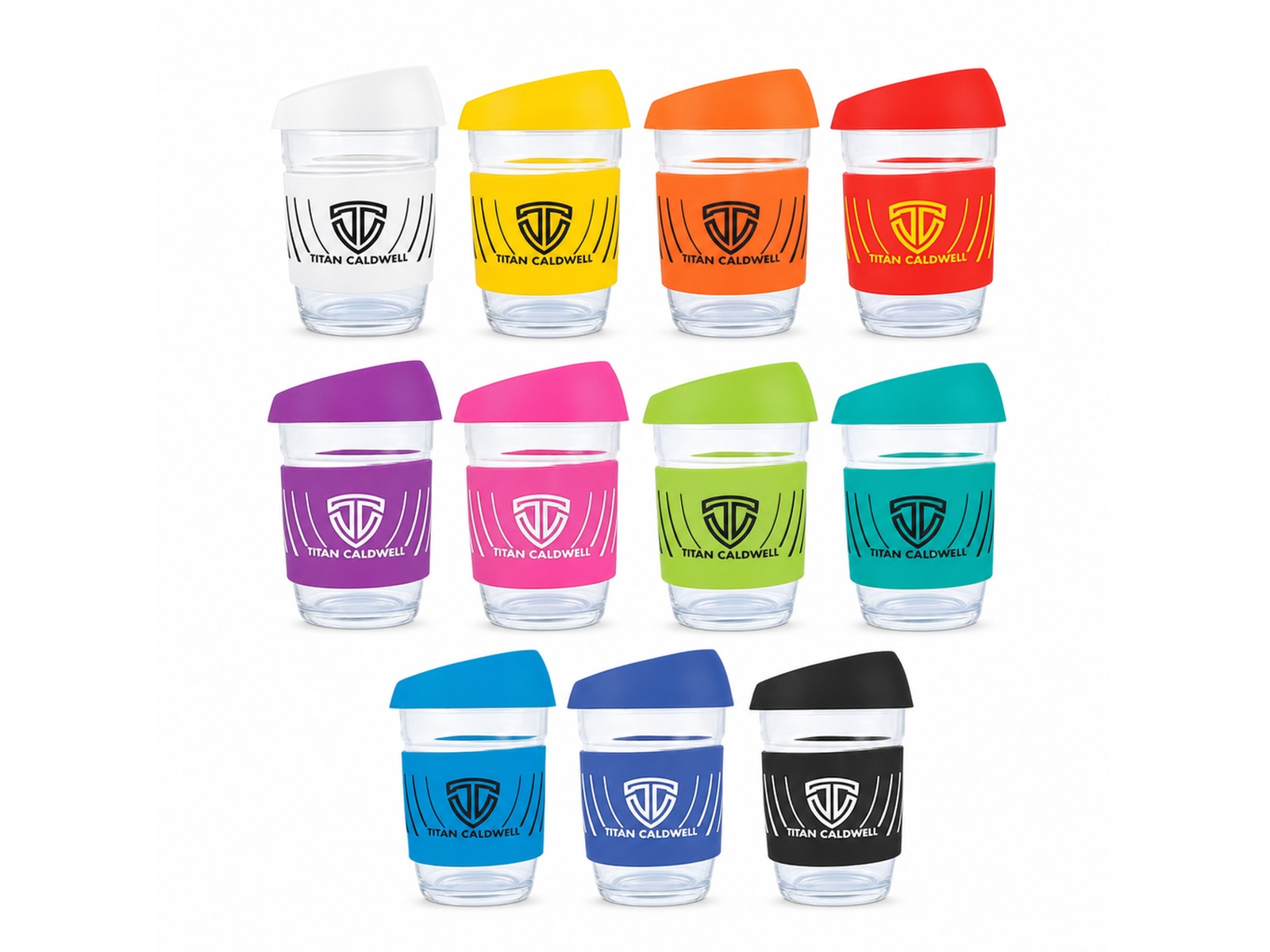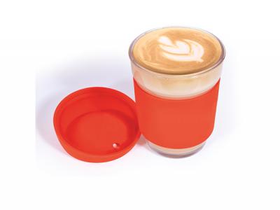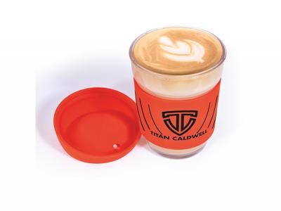 These Custom Glass Coffee Cups are a 320ml glass, reusable coffee cup with silicone sleeve and lid. Made from Borosilicate glass known for its durability and thermal shock resistance. Nominate your choice of lid and silicone sleeve colours. Packed in matt black window box.