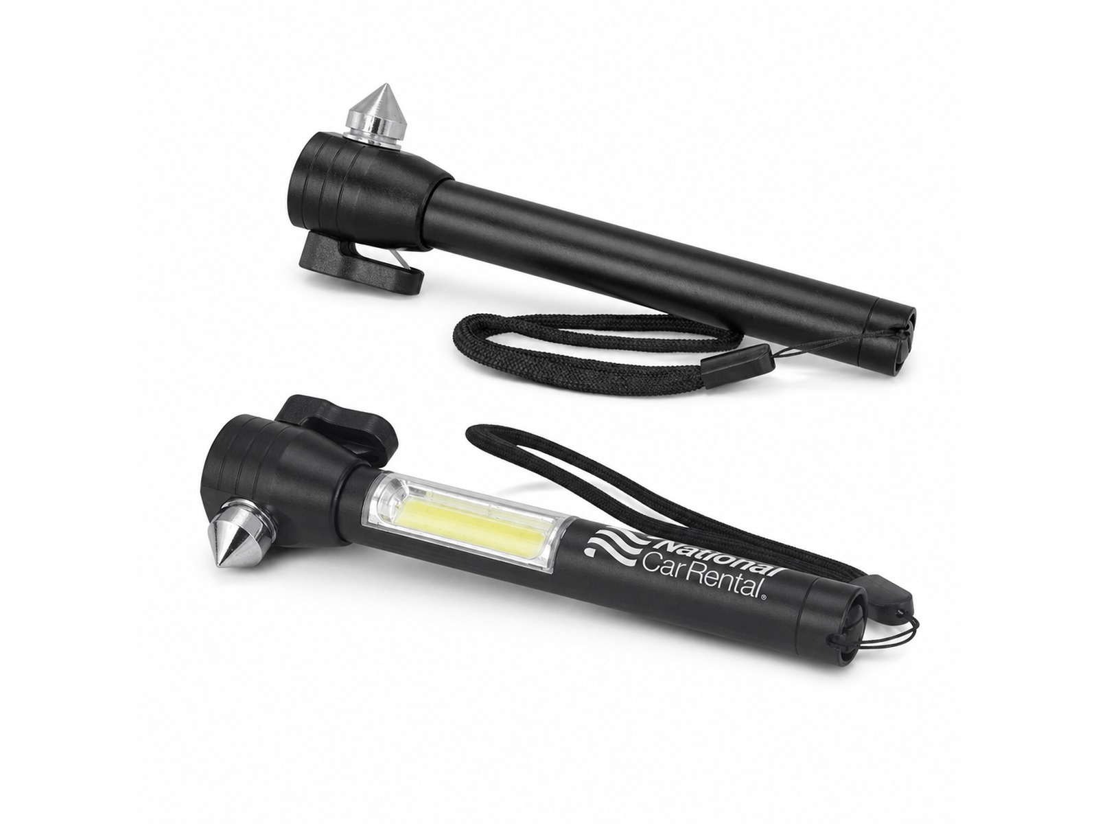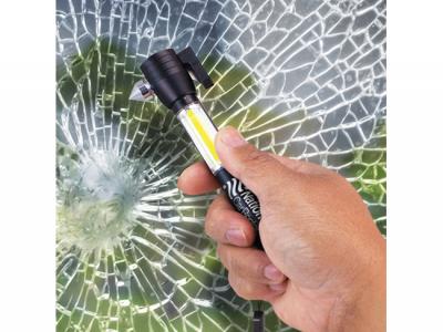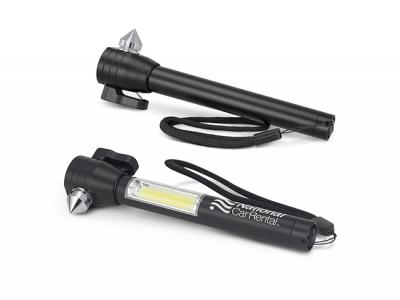 These compact multi-function metal safety tools for vehicles contain a hammer for breaking glass, a seat belt cutter, a powerful warning light as well as a strong magnet for attaching it to the top of a disabled vehicle. The light uses radical COB (Chip-on-Board) technology which increases both the light intensity and the battery life. These promotional tools also have a handy woven wrist strap and are powered by one AAA battery which is included in delivery.