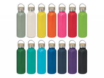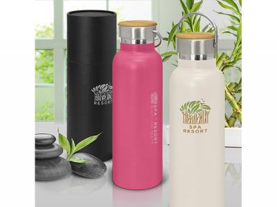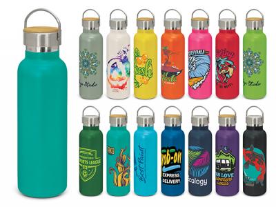 Custom Metal Bottles are an impressive 650ml double wall vacuum insulated stainless steel water bottle which will keep drinks cold for 24 hours or hot for up to 12 hours.These branded Water Bottles has an extremely durable powder coated matt finish, which produces stunning vibrant colours and is very resistant to scratching, chipping and wear. It has a trendy screw on lid with a stainless steel carry handle that offers a prominent branding opportunity and is available in full stainless steel or with a bamboo veneer. Bamboo is a natural material which produces unavoidable variances in the grain pattern, colour and branding.