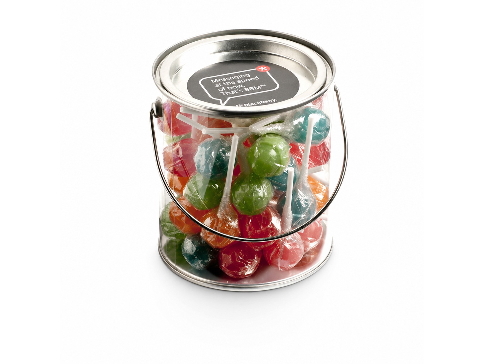 Personalize your clear buckets filled with chuppa chups or custom design lollies in tins for your marketing campaign.