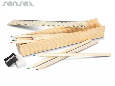 Pencil Sets In Wooden Pencil Case is a set of 8 x unpainted wood colouring in pencils, a pencil sharpener and an eraser in a natural wood box. The box has a sliding lid which doubles as a ruler with metric and imperial graduations and it laser engraves to natural etch. Wood is a natural material which produces unavoidable variances in the grain pattern, colour and branding. This is a great eco and enviro Pencil set in wooden case for all kids and adults alike.
