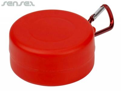 Compact Plastic foldable drinking cup (220 ml) with compartment for pills/sugar etc. with a carabiner belt clip for your backpack or bag. These are a great cup in a compact container for your bag, kids or outdoor activities, just clip them on.