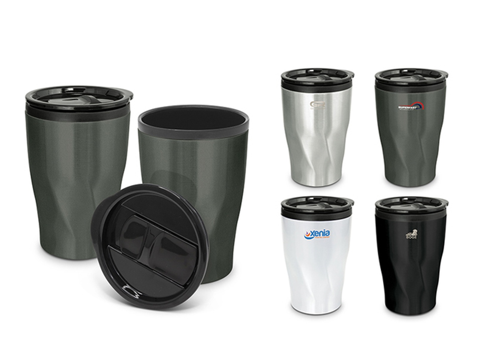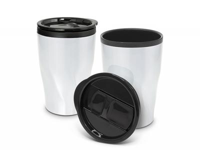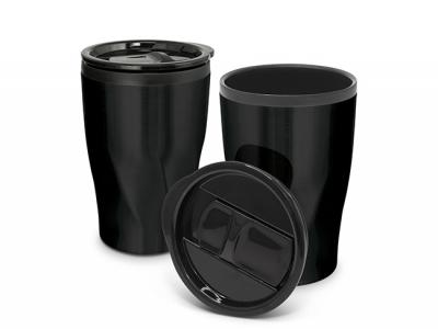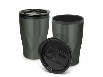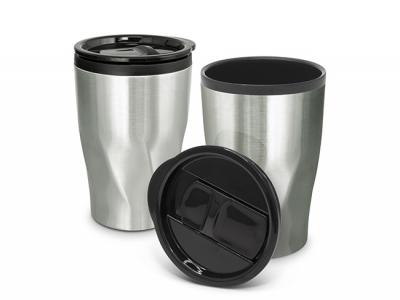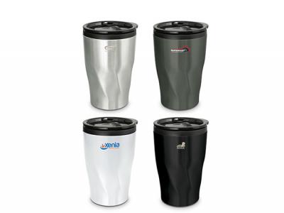 Naples Stainless Double Wall Cups is a 400ml double wall coffee cup which will keep drinks hot for longer. It features a radical twist patterned stainless steel outer wall and a polypropylene inner wall. Naples has a secure plastic push on lid with a splash proof sliding closure and a soft non-marking base. It laser engraves to a stainless steel finish and is BPA free. Handwashing is recommended. These Cups can come packaged in a Black Gift Box for an extra 80c per item.