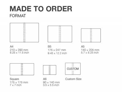 - Choice of size: A4 (210x290mm); B5 9175x247mm); A5 140x205mm); Square 176x175mm ; A6 90x140mm and custom size at surcharge.