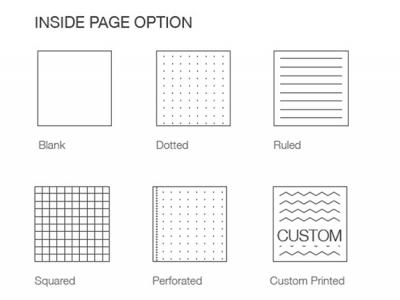 - Inside Page options: Blank; Dotted; Ruled; Squared; Perforated; Custom Printed