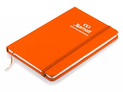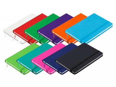 Vibrado Notebook Journals are a medium size notebook that is made from a soft Pu skin material. Vibrado Notebook contains 80 lined leaves (160 pages), an elastic closure band and a book mark ribbon to match. Soft material is perfect to screen print, digital print, or Deboss.