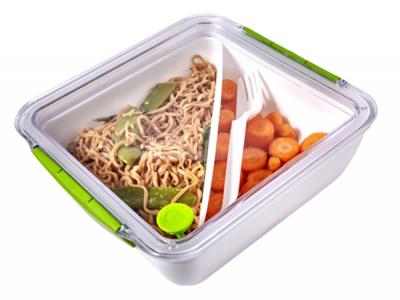 These promotional food containers feature a transparent lid, a silicone closure as well as an additional loose triangular compartment to keep ingredients separate and fresh. Furthermore, these lunch boxes will be supplied with a white fork.
