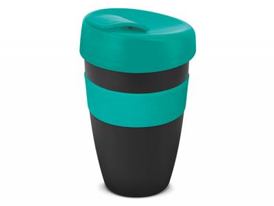 Alvo Flip Lid Reusable Coffee Cups are a large 480ml reusable coffee cup with a heat resistant silicone band and a secure screw on lid with a splash proof flip closure. Alvo manufactured from polypropylene which is shatterproof, odour resistant and BPA free. The cup, lid, flip closure and silicone band can be mixed and matched in any colour combination from the colour palette at no extra cost. Up to five different colour combinations are included in the price and more are available for an additional charge. It can be presented in an optional black gift box at an extra 80c per item. Handwashing is recommended.