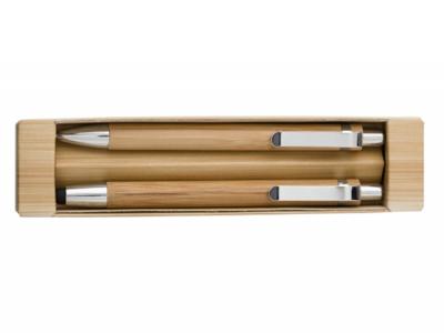 Bamboo pen set in cardboard box with sleeve, consisting of a click-action ballpoint pen with stylus and a mechanical pencil. The pen has blue ink and a convenient stylus for all office needs. The mechanical pencil is a great addition, for all creative types. These are a naturally classic gift for Architects or office staff.