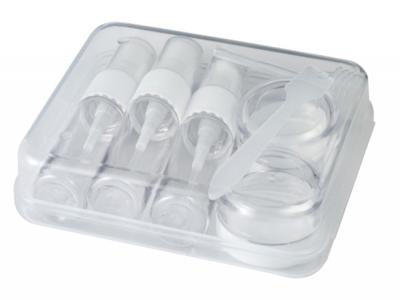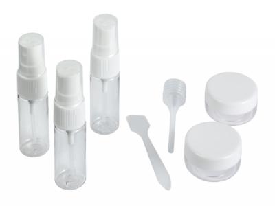 Cosmetic Bottle Travel Container Kits are a PET travel kit for cosmetics. The kit consists of three transparent spray bottles, a pipette, spatula and two round containers. The containers come in a clear plastic travel container for easy travelling. These are a great promotional branded giveaway item practical for anyone to use.