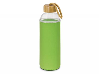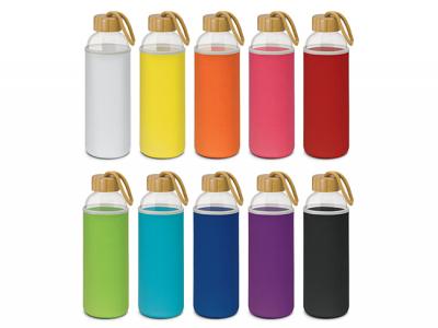 Aqua Borosilicate Glass Drink Bottles are a sophisticated 600ml borosilicate glass drink bottle which has a soft insulating neoprene sleeve that keeps drinks cool for longer. It has a natural screw on bamboo lid with a matching braided carry handle. Borosilicate is a lightweight glass that is exceptionally strong and shatter resistant. Glass is a natural choice for a clean, pure taste and it offers a safe and eco friendly alternative. This product is not intended to be used with carbonated or hot liquids and handwashing is recommended. Wood is a natural material which produces unavoidable variances in the grain pattern, colour and branding.
