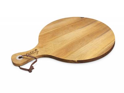 Personalised Cheese Boards are a large round serving board which is manufactured from FSC approved acacia wood. The handle has a stainless steel rivet with a leather strap which can be used for hanging the board up when not in use. The serving board laser engraves to a natural etch and is beautifully presented in a matt black gift box. Wood is a natural material which produces unavoidable variances in the grain pattern, colour and branding.