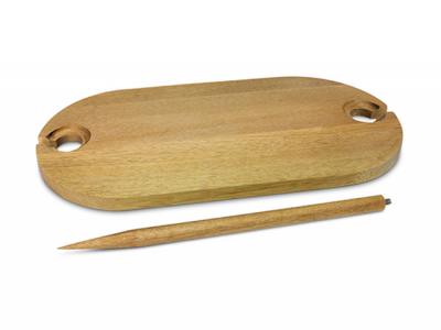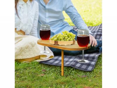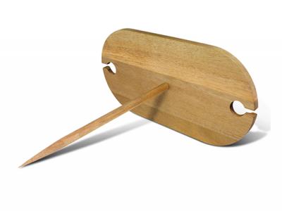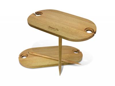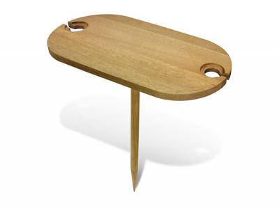 Wooden Wine Glass Holders are a unique two person wine table which is manufactured from FSC approved acacia wood. It has a tough wood spike which screws into the table top and pushes into the ground; making it ideal for use in most outdoor situations including the beach. Both wine glasses are held securely by sliding the stems into the table and this leaves room for some snacks. It laser engraves to a natural etch and is presented flat packed in a matt black gift box. Wood is a natural material which produces unavoidable variances in the grain pattern, colour and branding.