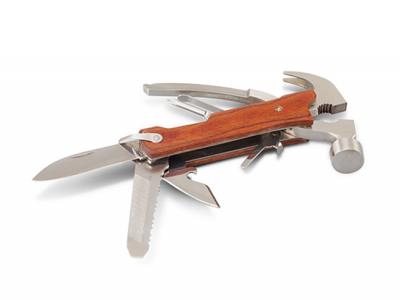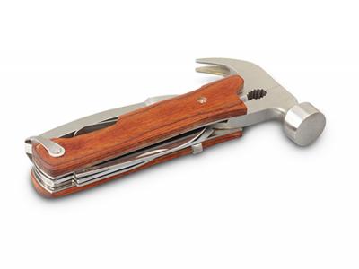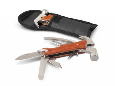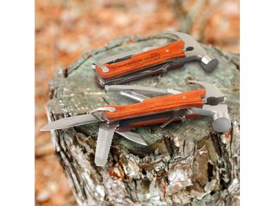 12 Function Multi Stainless Tools are a premium stainless steel multi tool which has 12 functions and features a claw hammer. It has a birch wood hand grip, a carry pouch with a Velcro closure and a belt loop. This tool laser engraves to a natural etch. Wood is a natural material which produces unavoidable variances in the grain pattern, colour and branding.