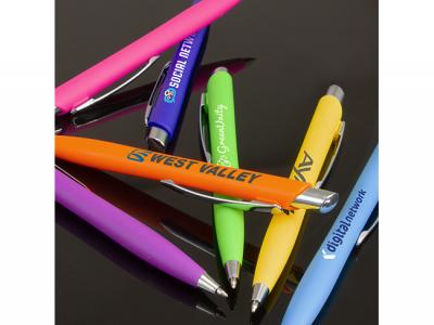 Soft Touch Custom Pens are a retractable plastic ball pen which has a soft touch matt finish. This custom plastic pen has a blue refill with 1200 metres of German manufactured Dokumental ink and a tungsten carbide ball for improved writing quality. These printed plastic pens are simple and stylish, great for any office or promotion.