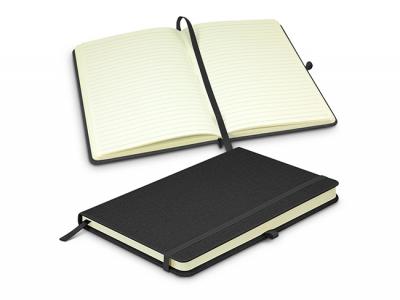 Sleek medium size custom notebooks with 80 leaves (160 pages) of 80gsm lined cream paper. It has a hard cover with a woven PU finish. Other features include an elastic closure band, a bookmark ribbon and a pen loop.
