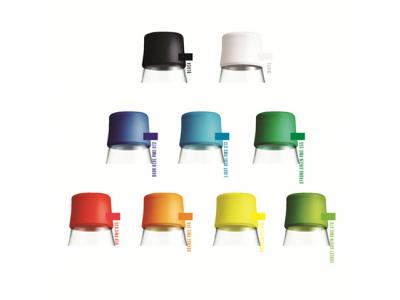 Colours: Black, Dark Blue, Forest Green, Frosted White, Grey, Light Blue, Orange, Pink, Purple, Red, Strong Green, Yellow (mix and match lid colours).