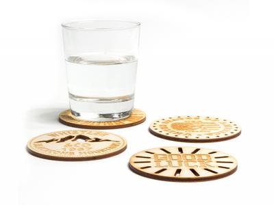 Personalize your engraved chunky plywood coasters - round (4mm) or custom design coasters for your marketing campaign.