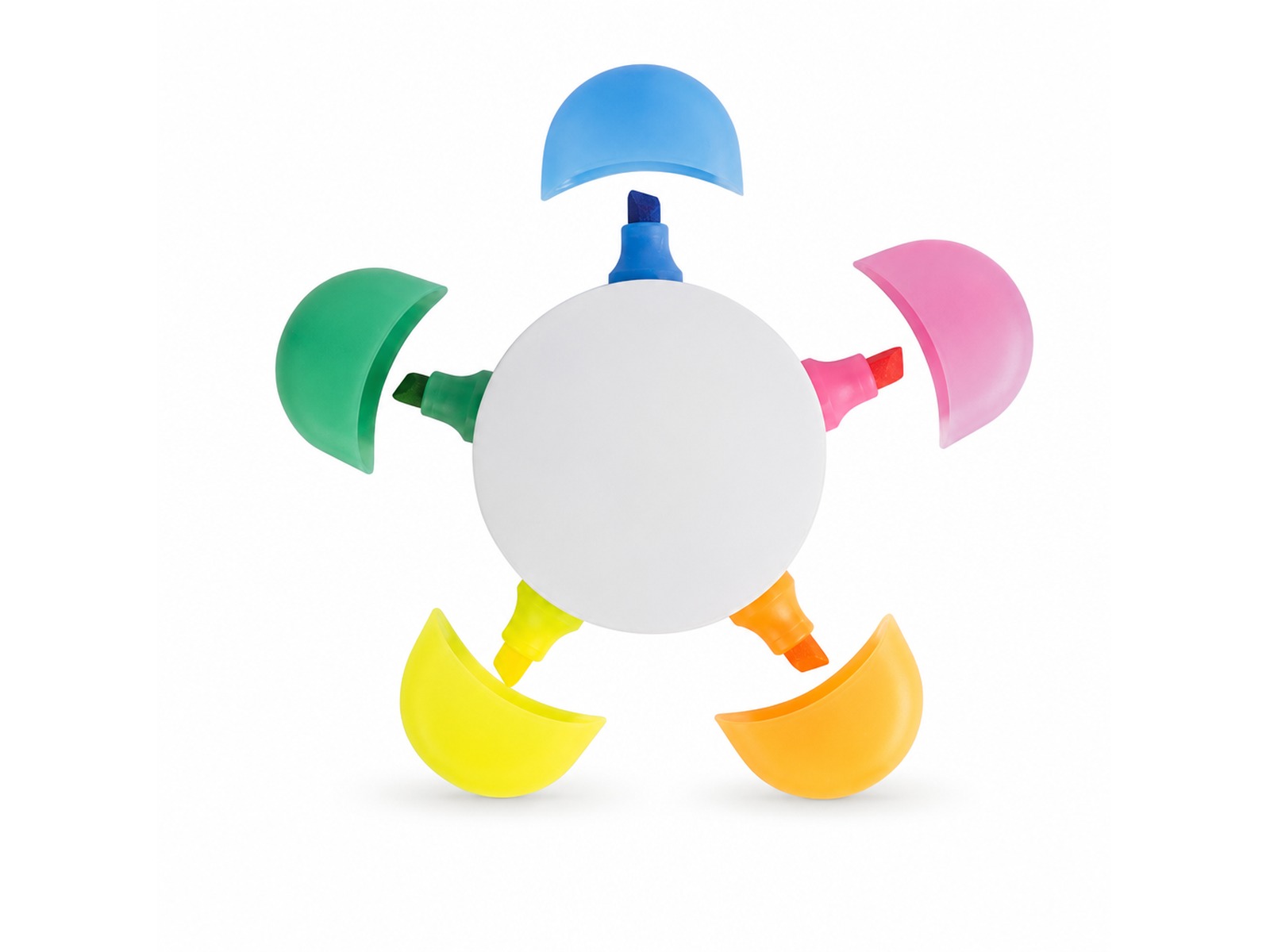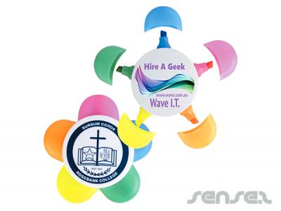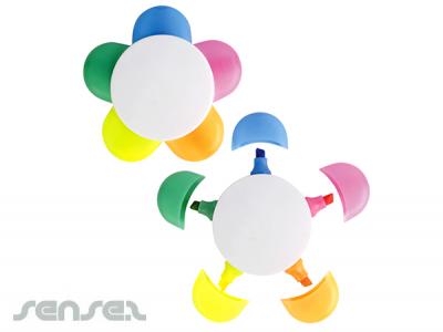 Promotional Highlighters are in a daisy shape with 5 different highlighter colours. White centre with Pink, Orange, Yellow, Green and Blue highlight colours with matching lids.
