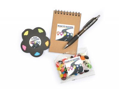 Show your clients and staff how much you care about their well being and promote your brand at the same time with our exclusively selected care packages! Our handy work from home packs provide all the stationery which is required to set up a home office perfectly and to be well prepared at this new workplace. The sets contain sticky notes, a notebook, a pen as well as bag of yummy jelly beans as snack in between. your logo will be printed onto each of these items and will also be displayed in stunning full colour on the header of the bags!