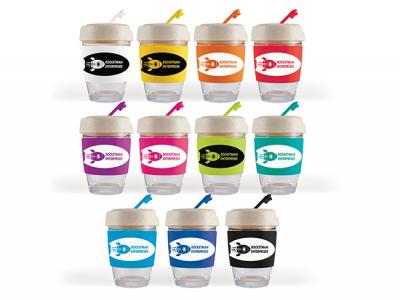Personalize your eco flip lid glass coffee cups with silicone bands (320ml) or custom design glass travel cups for your marketing campaign.