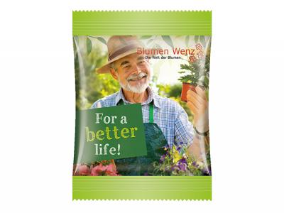 Vegan snacks are right on trend! Vegan jelly bears allow you to address a consciously-consuming target group and to advertise effectively. The climate-neutral mini bag in white or transparent, optionally compostable foil that can be individually printed provides enough space for your customised design and strong promotional messages. Use vegan power!