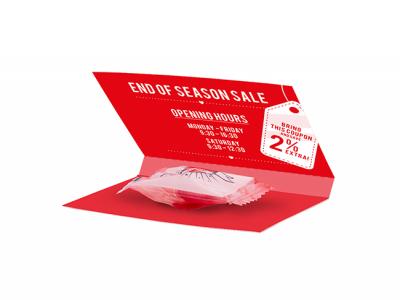 The climate-neutral promotion fold-out card has an expressive appearance and provides universal usage possibilities for advertising companies. On the inside is either a delicious heart-shaped sweet in a compostable flowpack (3.4g) or a refreshing Mentos chewy candy (2.6g). The practical tear-off perforation of the FSC-certified folding card is simply sensational. Original business cards or a point of sale gift certificates - there are no limits to your imagination and creativity here.