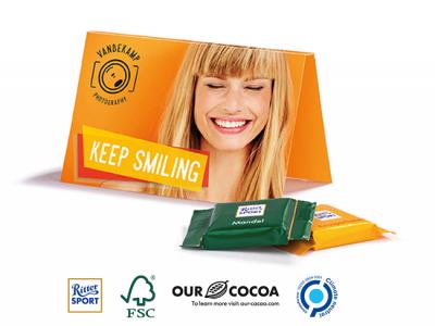 Print your logo onto these custom printed promotion cards with ritter sport minis or chocolate hearts (5g) or one of our other innovative ritter sport chocolates and use them in your next marketing campaign as a unique giveaway item.