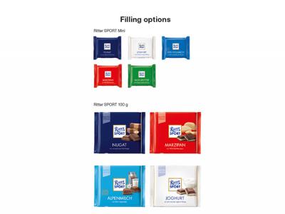 Content: Four Ritter SPORT mini chocolate bars, 16.5g each or one 100g bar. Additional varieties available upon request with a minimum order quantity of 1.000 pieces (100g bars).