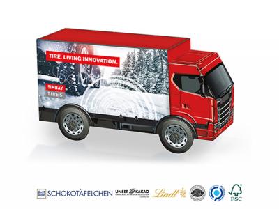 A truck can’t load that much! - Yes it can. Our custom printed truck can even do more! Thanks to various filling options and strong brands like Mentos, Ritter SPORT or Lorenz, it can bring your advertising to the customer in a reliable and unforgettable way. Comprising of FSC-certfied card board and a 100% climate neutral production, it’s the ideal sustainable giveaway.