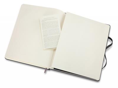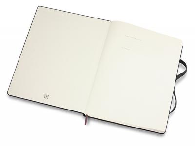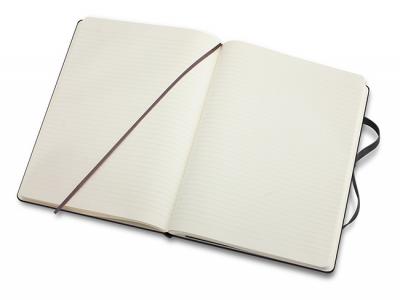 The classic hard cover, large notebook features 96 leaves (192 pages) of 70g/m² Moleskine ivory-coloured lined paper with rounded edges, a bookmark ribbon, and an elastic closure for privacy. The expandable back pocket provides space for storing notes and mementos and includes the history of Moleskine. A customisable ’In case of loss’ notice is printed on the first page, while the Moleskine logo is subtly debossed on the back cover and printed on the inside front cover.